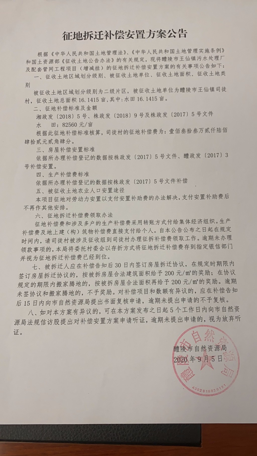 征地拆迁补偿安置方案公告(醴陵市王仙镇污水处理厂及配套管网工程项目)
