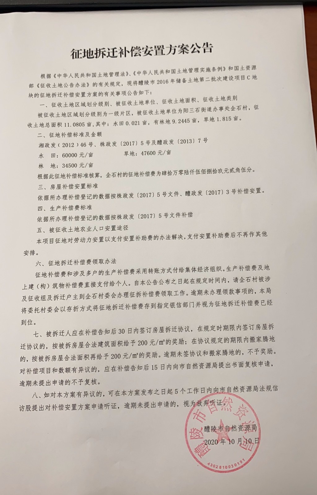 征地拆迁补偿安置方案公告(醴陵市2016年储备土地第二批次建设项目C地块)