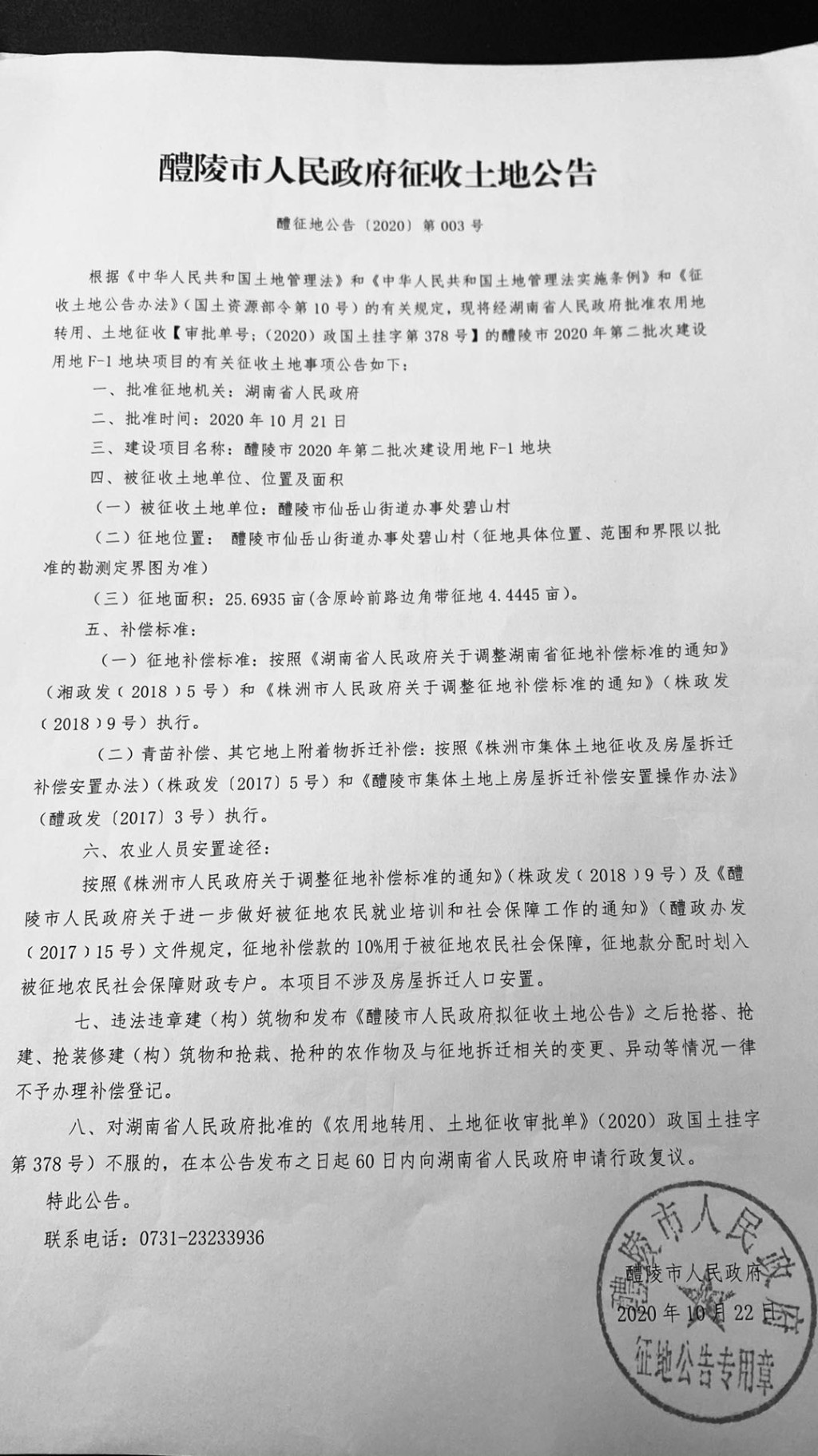 醴陵市人民政府征收土地公告(醴陵市2020年第二批次建设用地F-1地块)