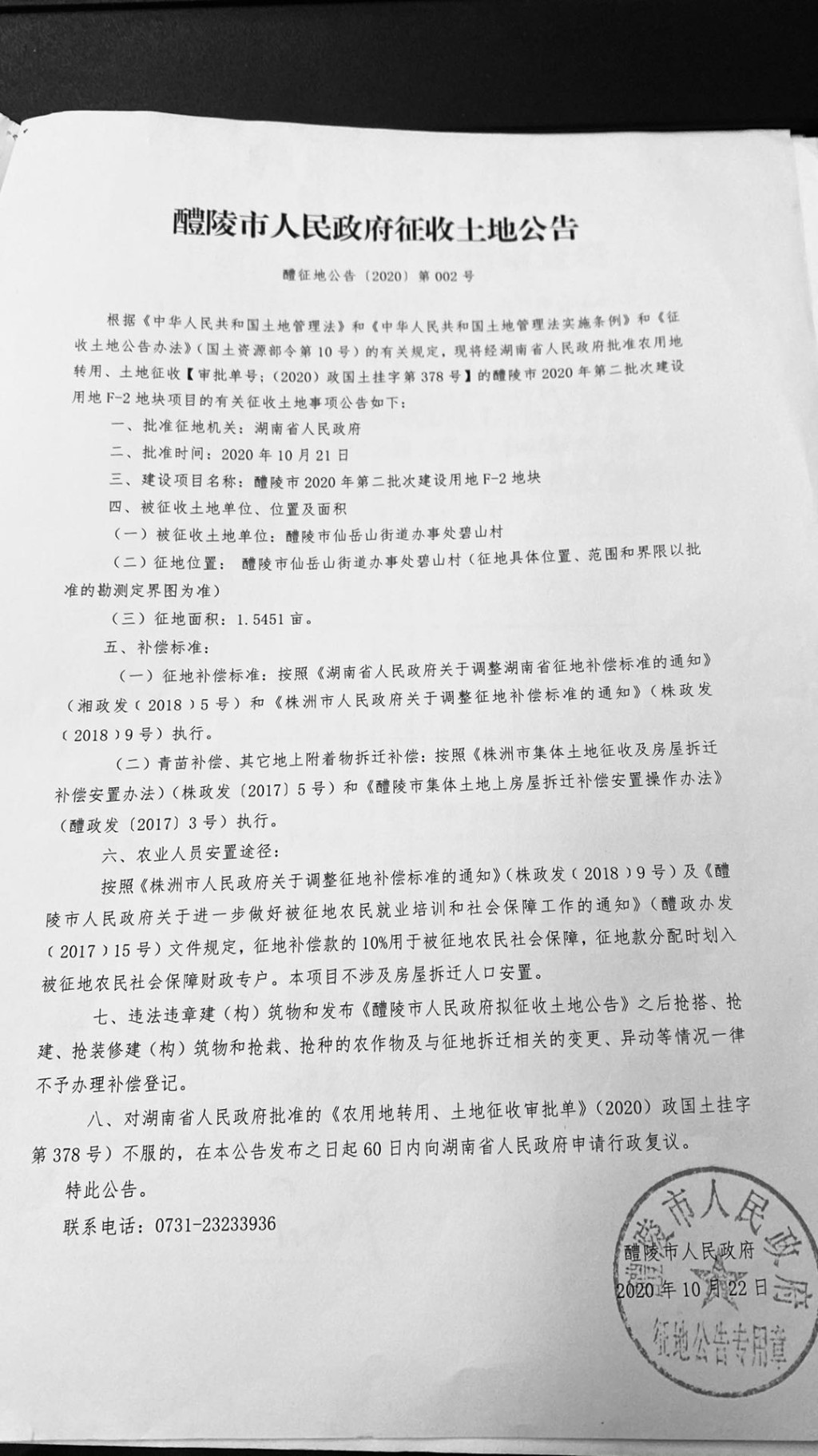醴陵市人民政府征收土地公告(醴陵市2020年第二批次建设用地F-2地块)