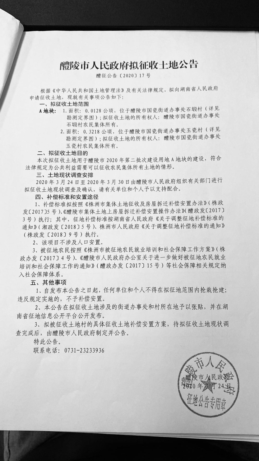 醴陵市人民政府拟征收土地公告(2020年第二批次建设用地A地块)