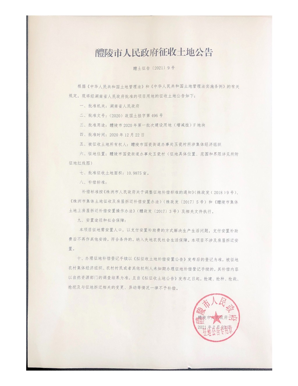 醴陵市人民政府征收土地公告(醴陵市2020年第一批次建设用地(增减挂)F地块项目)