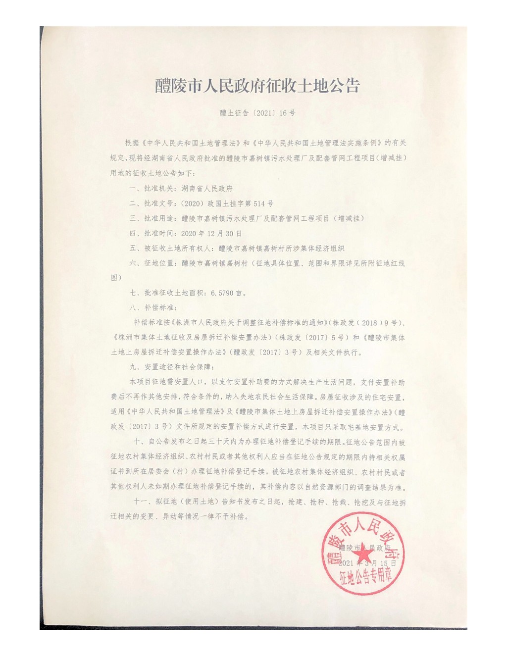醴陵市人民政府征收土地公告(醴陵市嘉树镇污水处理厂及配套管网工程项目(增减挂)项目)