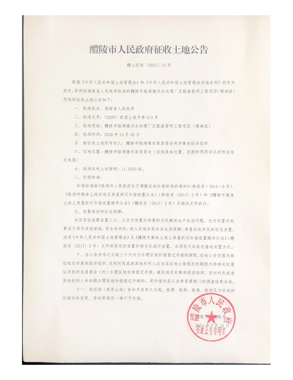 醴陵市人民政府征收土地公告(醴陵市船湾镇污水处理厂及配套管网工程项目(增减挂))