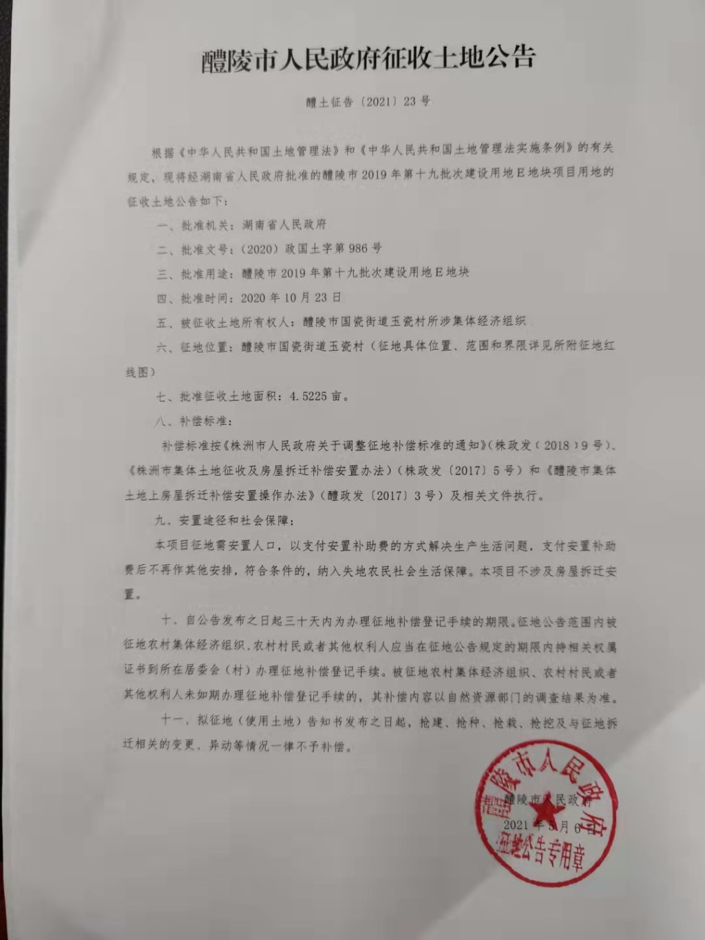 醴陵市人民政府征收土地公告(醴陵市2019年第十九批次建设用地E地块项目)