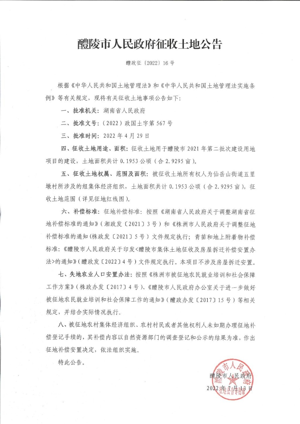 醴陵市人民政府征收土地公告(醴陵市2021年第二批次建设用地征收公告)