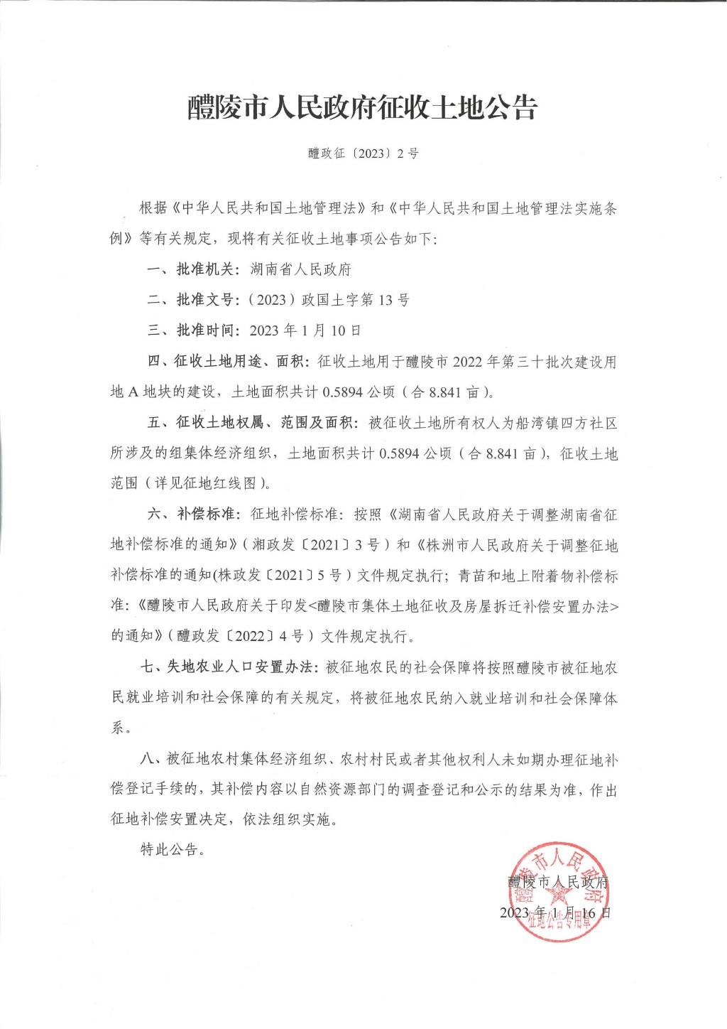 醴陵市人民政府征收土地公告(醴陵市2022年第三十批次建设用地征收土地公告)