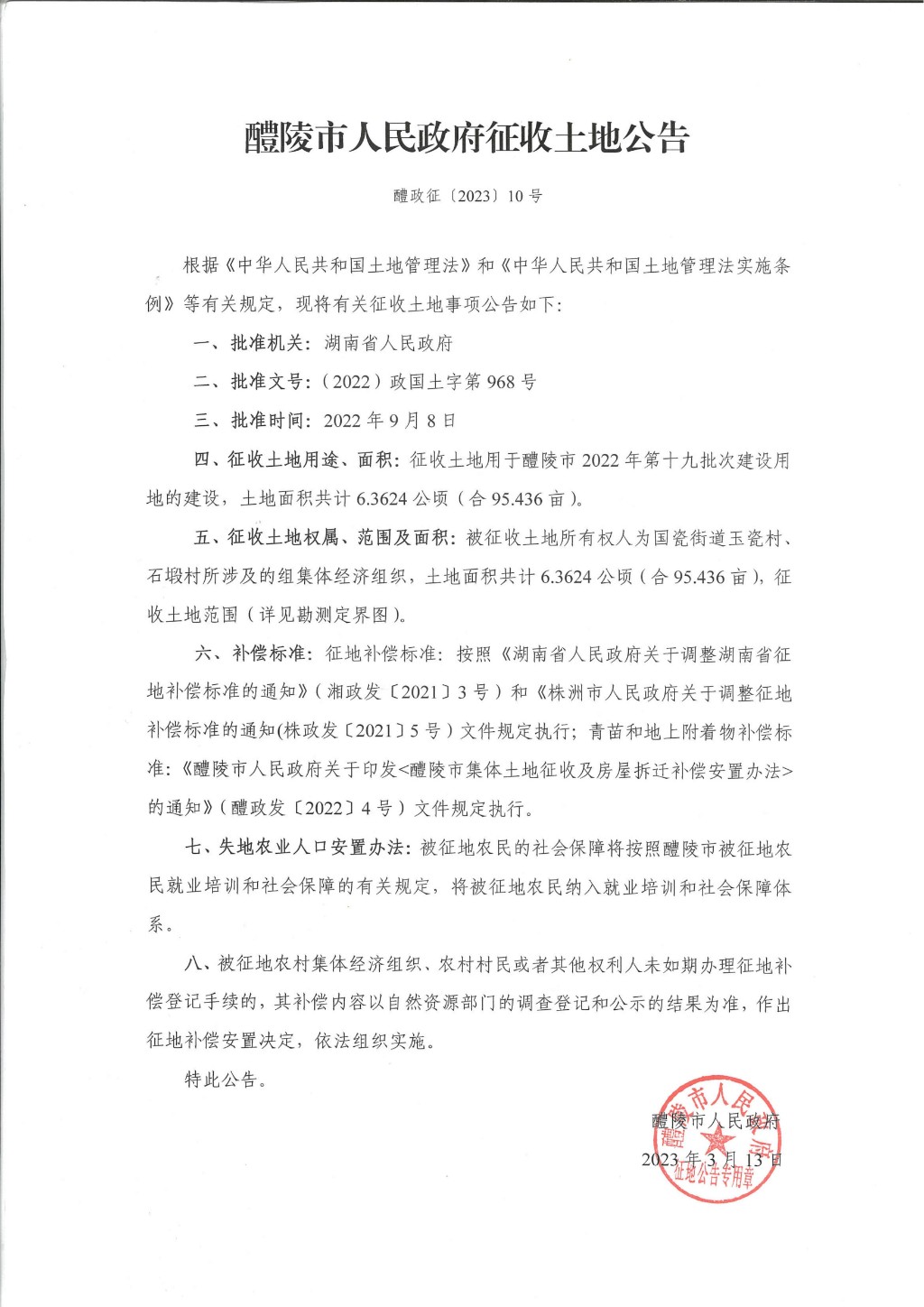醴陵市人民政府征收土地公告(醴陵市2022年第十九批次建设用地征收土地公告)
