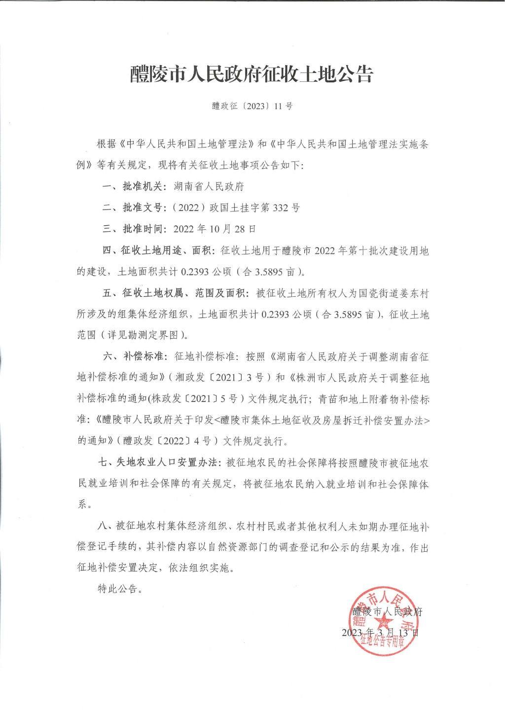 醴陵市人民政府征收土地公告(醴陵市2022年第十批次建设用地征收土地公告)