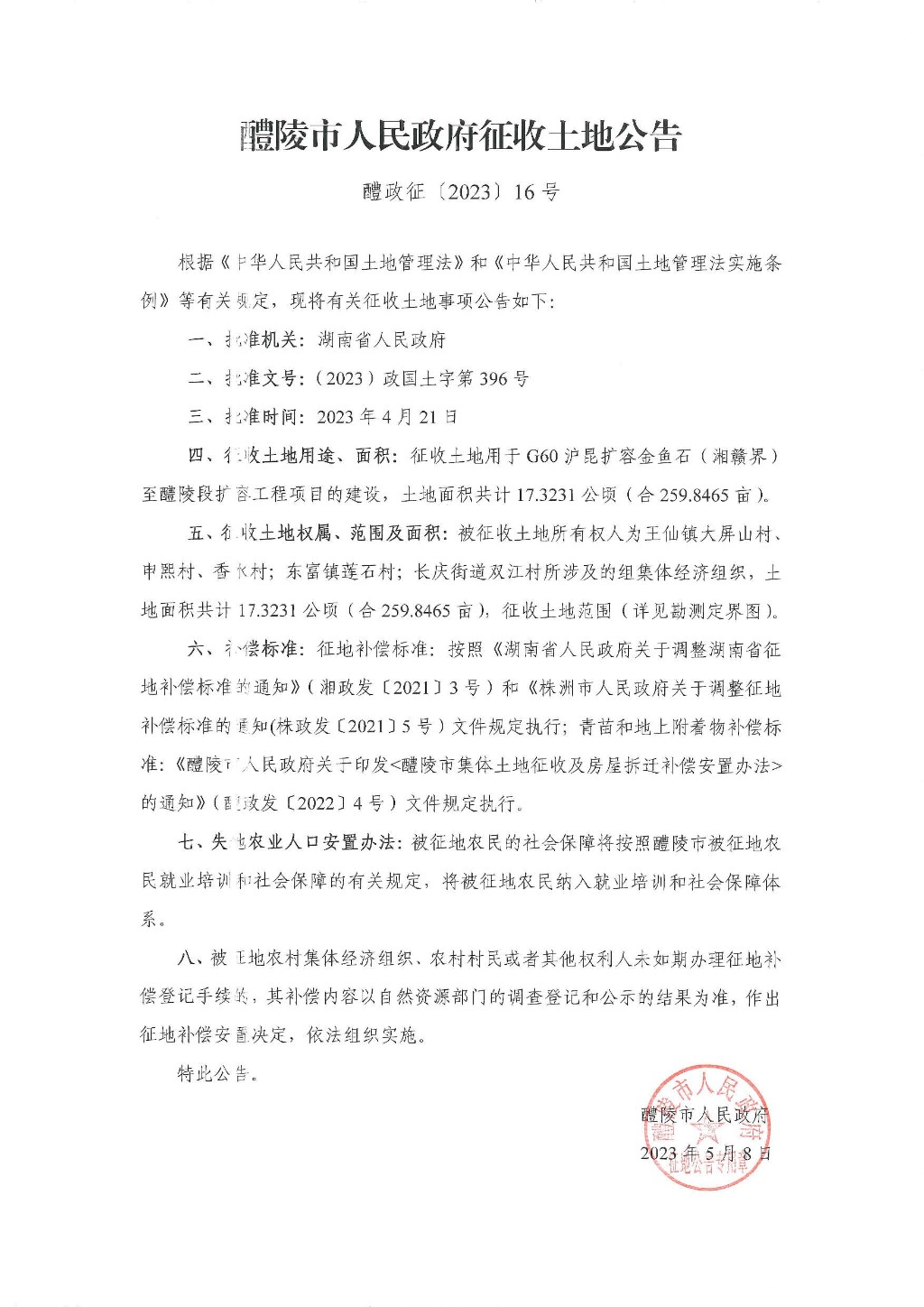 醴陵市人民政府征收土地公告(G60沪昆扩容金鱼石(湘赣界)至醴陵段扩容工程项目(醴政征 (2023) 16号))
