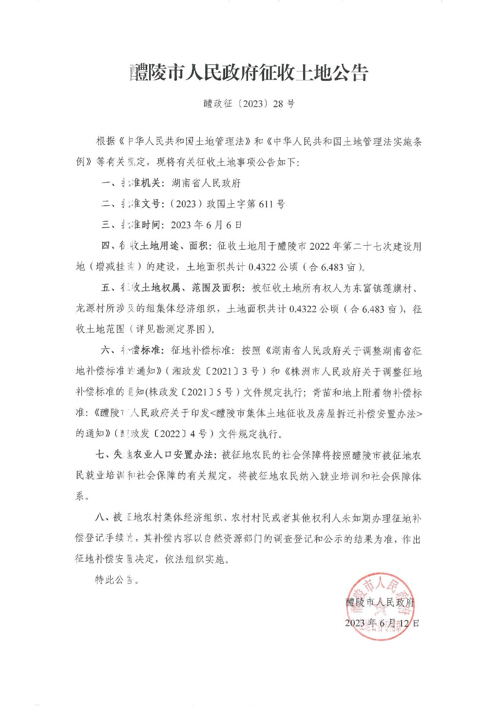 醴陵市人民政府征收土地公告(醴陵市2023年第二十七次建设用地(增减挂钩)的建设(醴政征(2023) 28号))