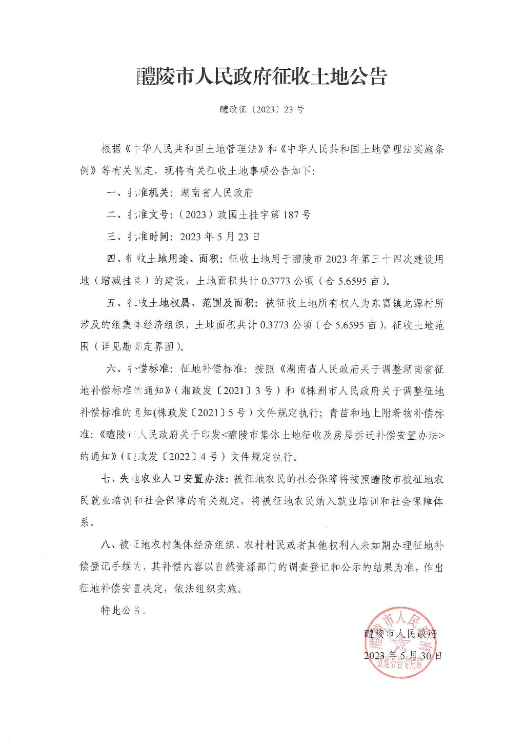 醴陵市人民政府征收土地公告(醴陵市2023年第三十四次建设用地(增减挂钩)的建设(醴政征(2023) 23号))