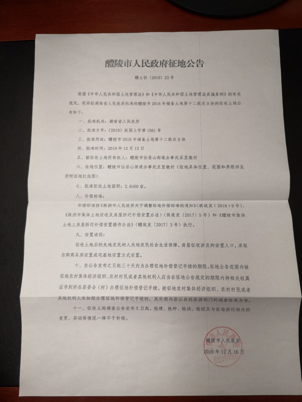 醴陵市人民政府征地公告(醴陵市2018年储备土地第十二批次D块)