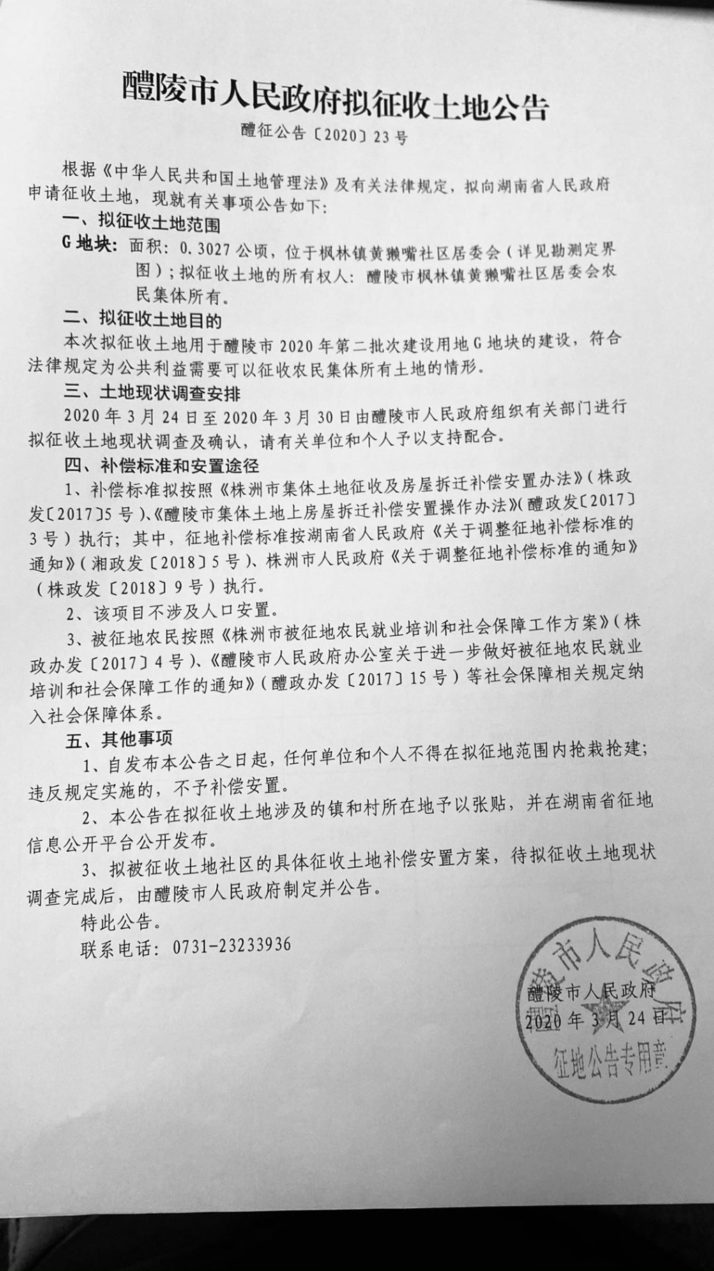 醴陵市人民政府拟征收土地公告(醴陵市2020年第二批次建设用地G地块)