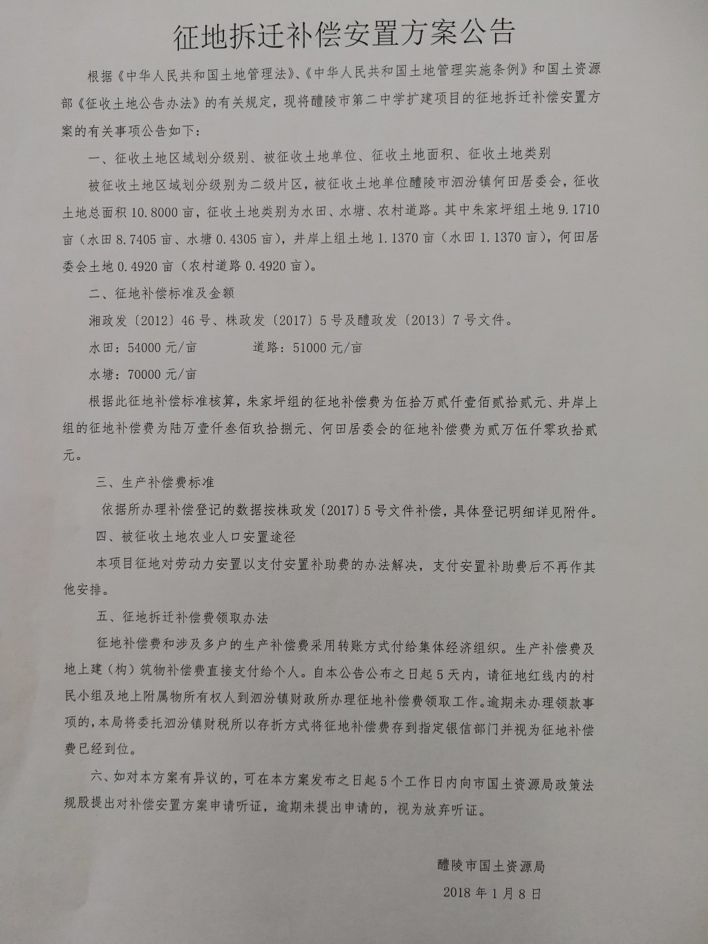 征地拆迁补偿安置方案公告(醴陵市第二中学扩建项目)