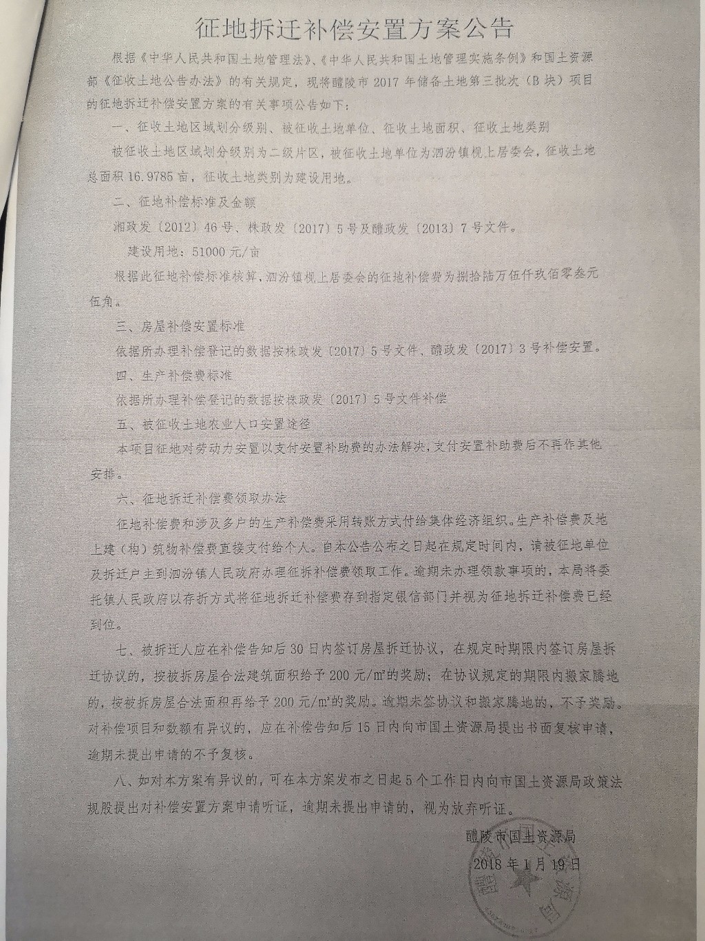 征地拆迁补偿安置方案公告(醴陵市2017年储备土地第三批次-B块项目)