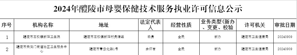 2024年醴陵市母婴保健技术服务执业许可信息公示
