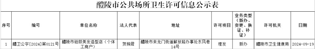 醴陵市公共场所卫生许可信息公示表