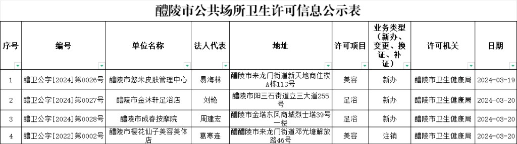 醴陵市公共场所卫生许可信息公示表