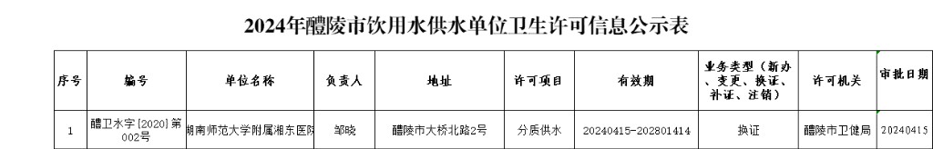 2024年醴陵市饮用水供水单位卫生许可信息公示表
