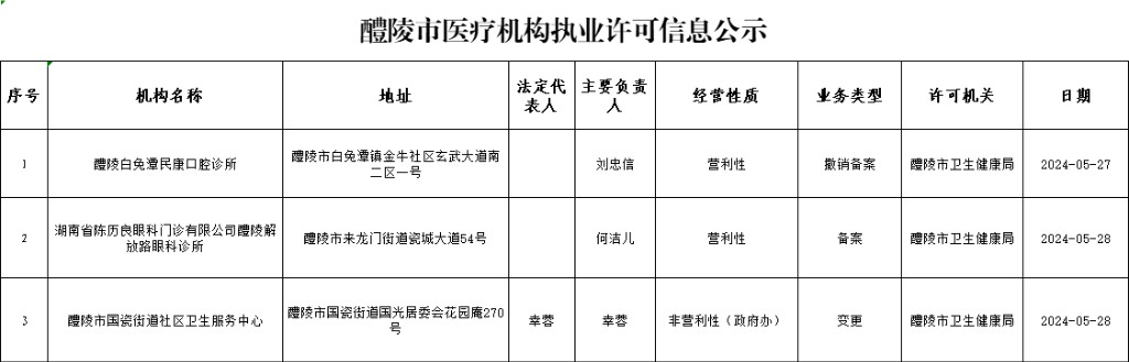 醴陵市医疗机构执业许可信息公示